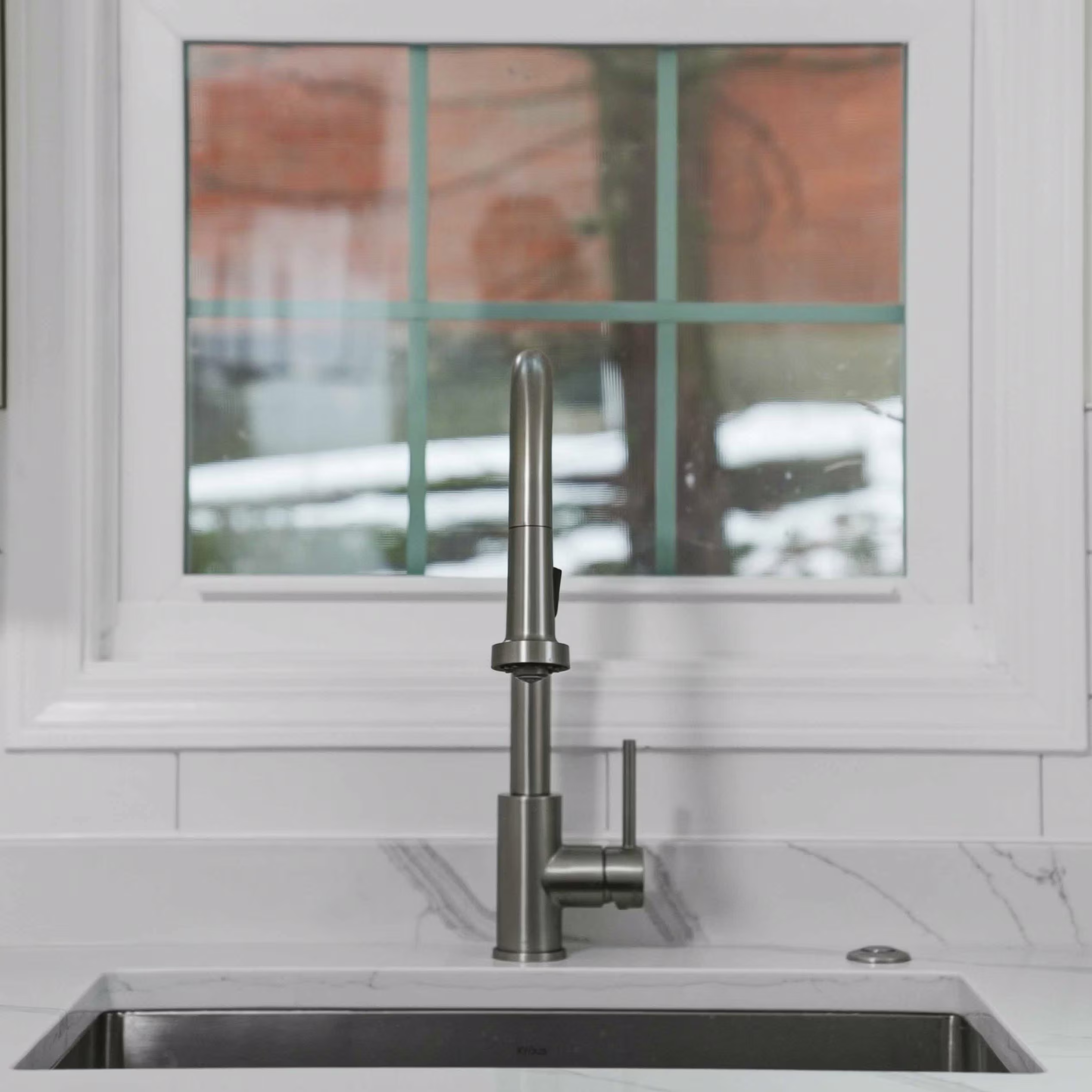 This kitchen was designed to feel bright and expansive, utilizing a clean "white-on-white" palette. We still added our touch of color with the beige large-format tile flooring though, installed in a diagonal checkerboard pattern.