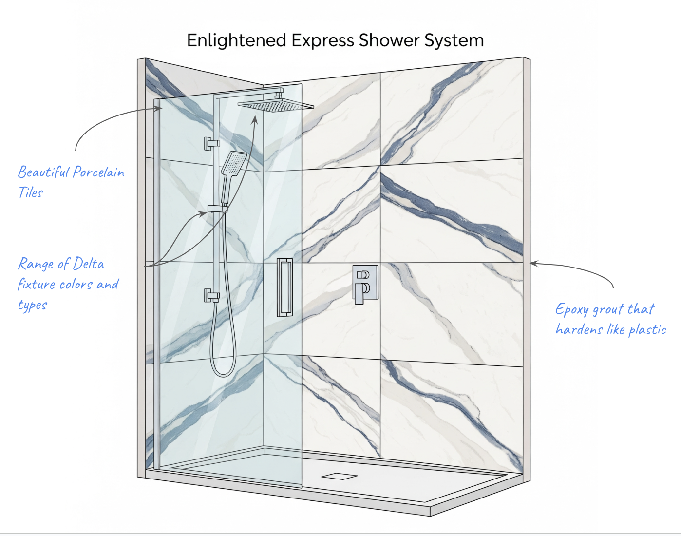 After hearing the same frustrations from clients for years, we developed our own "happy medium" that delivers the best of both worlds: The Enlightened Express Shower.