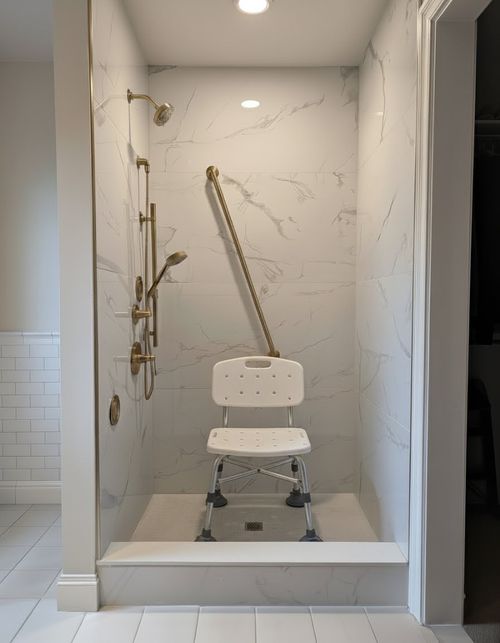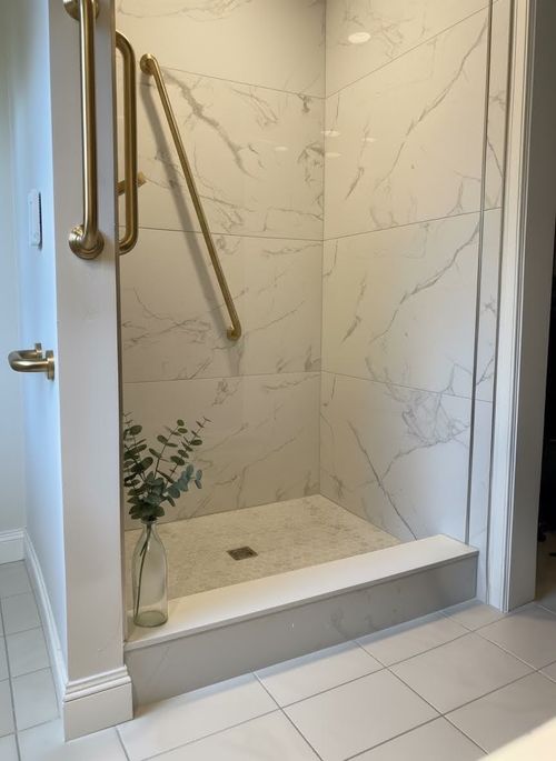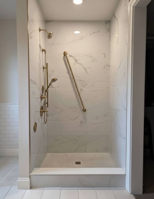 We created the perfect blend of safety and style with our latest accessible bathroom remodel in Pittsburgh. This walk-in shower features elegant marbled porcelain tile, brushed brass fixtures, and essential ADA-compliant grab bars, designed for seniors and aging-in-place. Experience a spa-like retreat with the security you need.