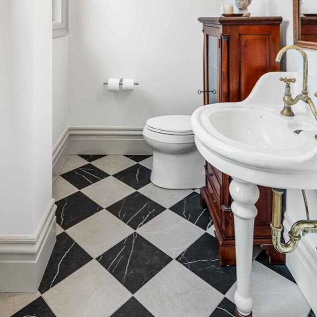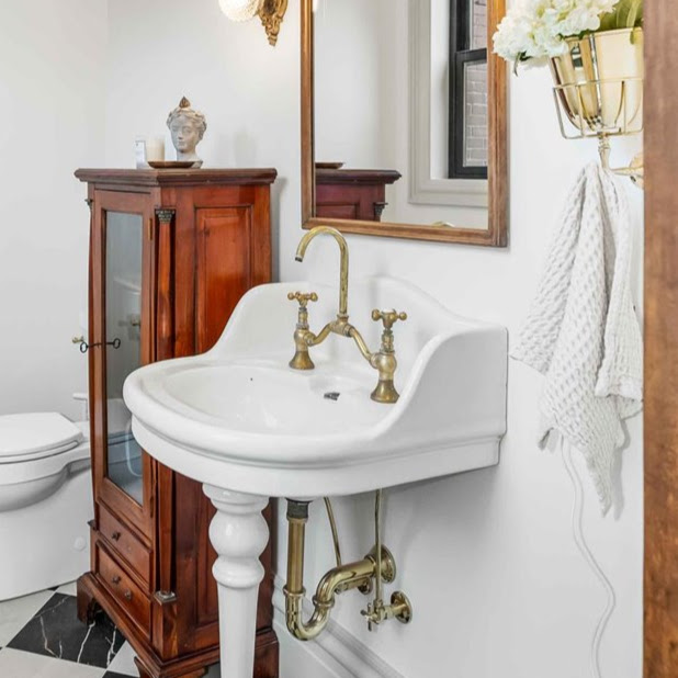 To achieve this, we did a few key things. First, we established a strong visual connection between the two rooms by laying a bold, checkerboard floor with black and white marble tiles. This became the foundation of the design. The client wanted to incorporate vintage elements, so for the powder room, we paired an antique-style wooden vanity and mirror with a traditional pedestal sink. We selected warm brass for the faucet and the wall sconce to add a touch of warmth.