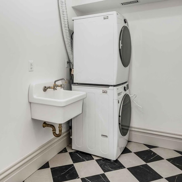 In the laundry room, we continued that same material palette. We installed a deep, wall-mounted utility sink with exposed brass plumbing that mirrors the fixtures in the bathroom. By keeping the walls in both spaces a crisp, simple white, we allowed the dramatic flooring and the specific details of the fixtures and furniture to really stand out. Check out the rest of the house!