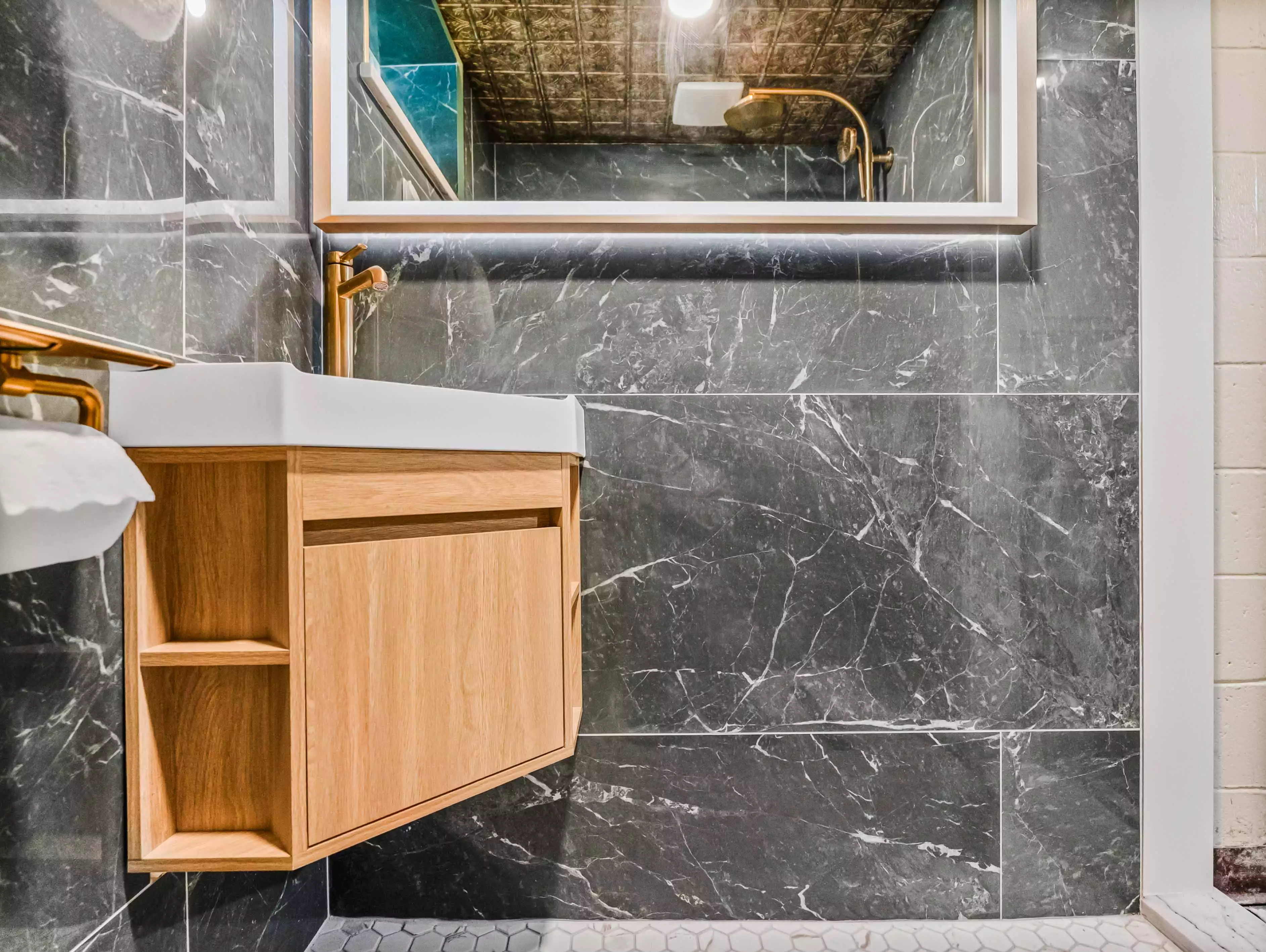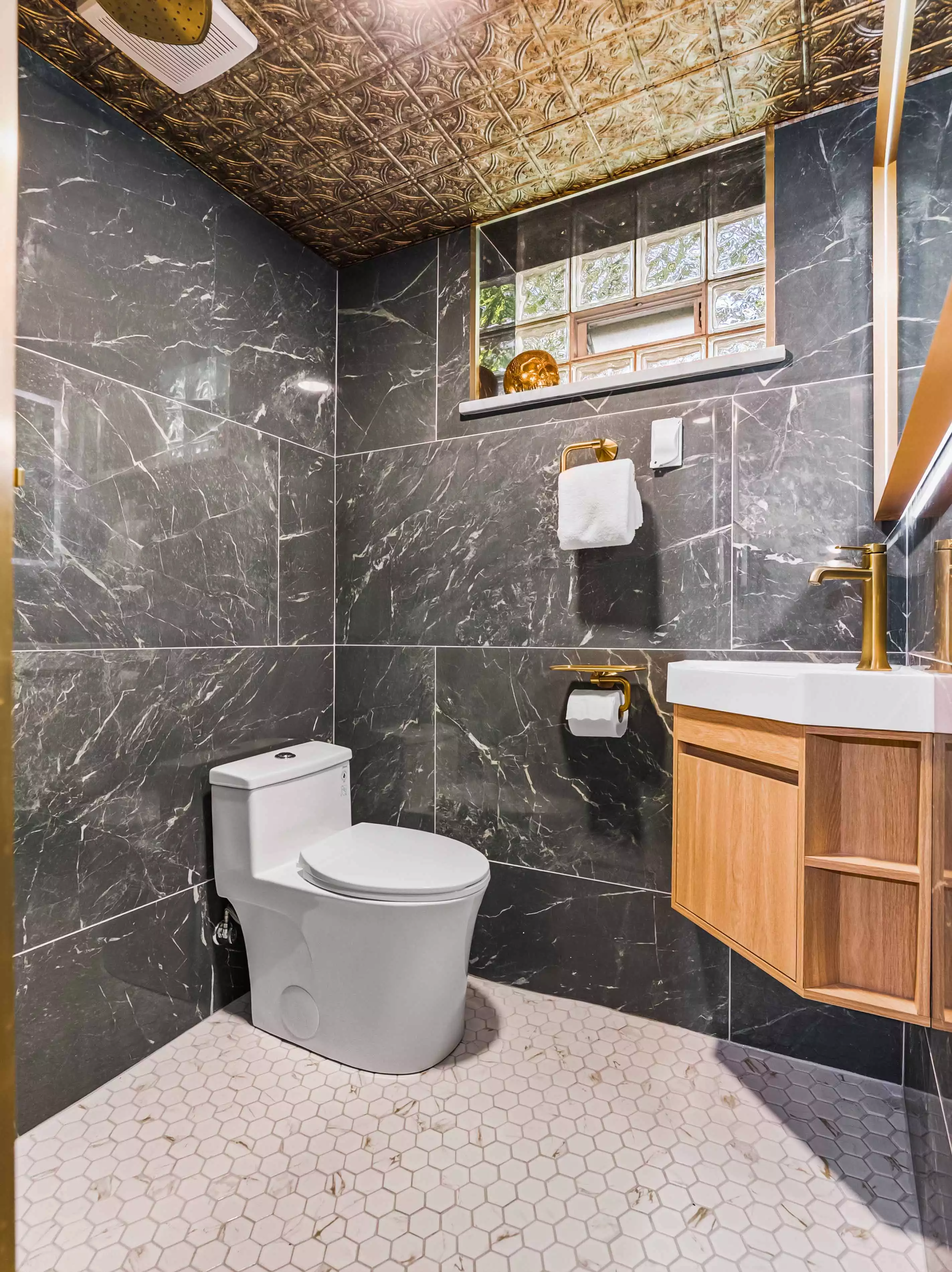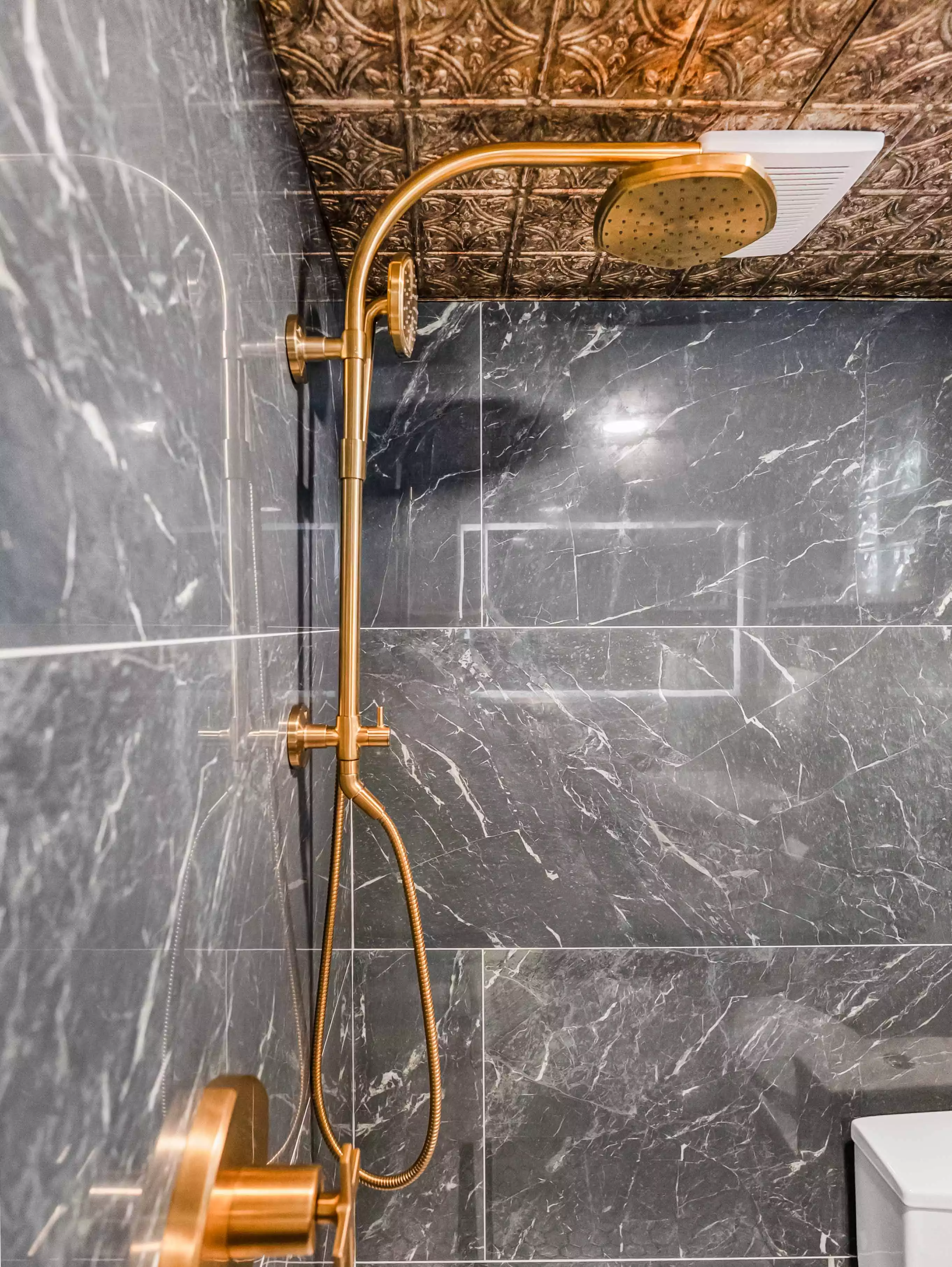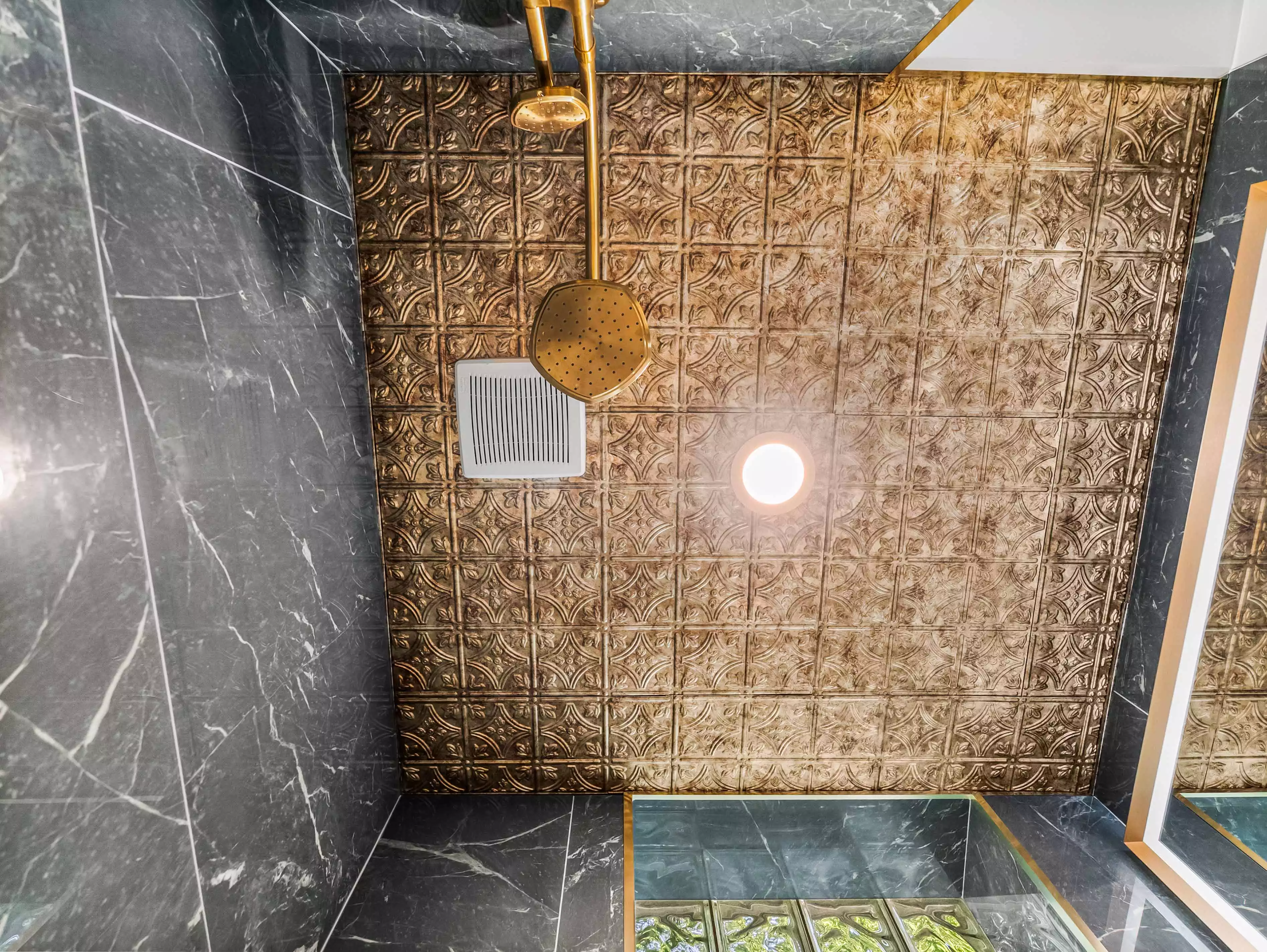 Bold Black Marble Walls & a Copper Tin Ceiling | Modern Bathroom Remodel