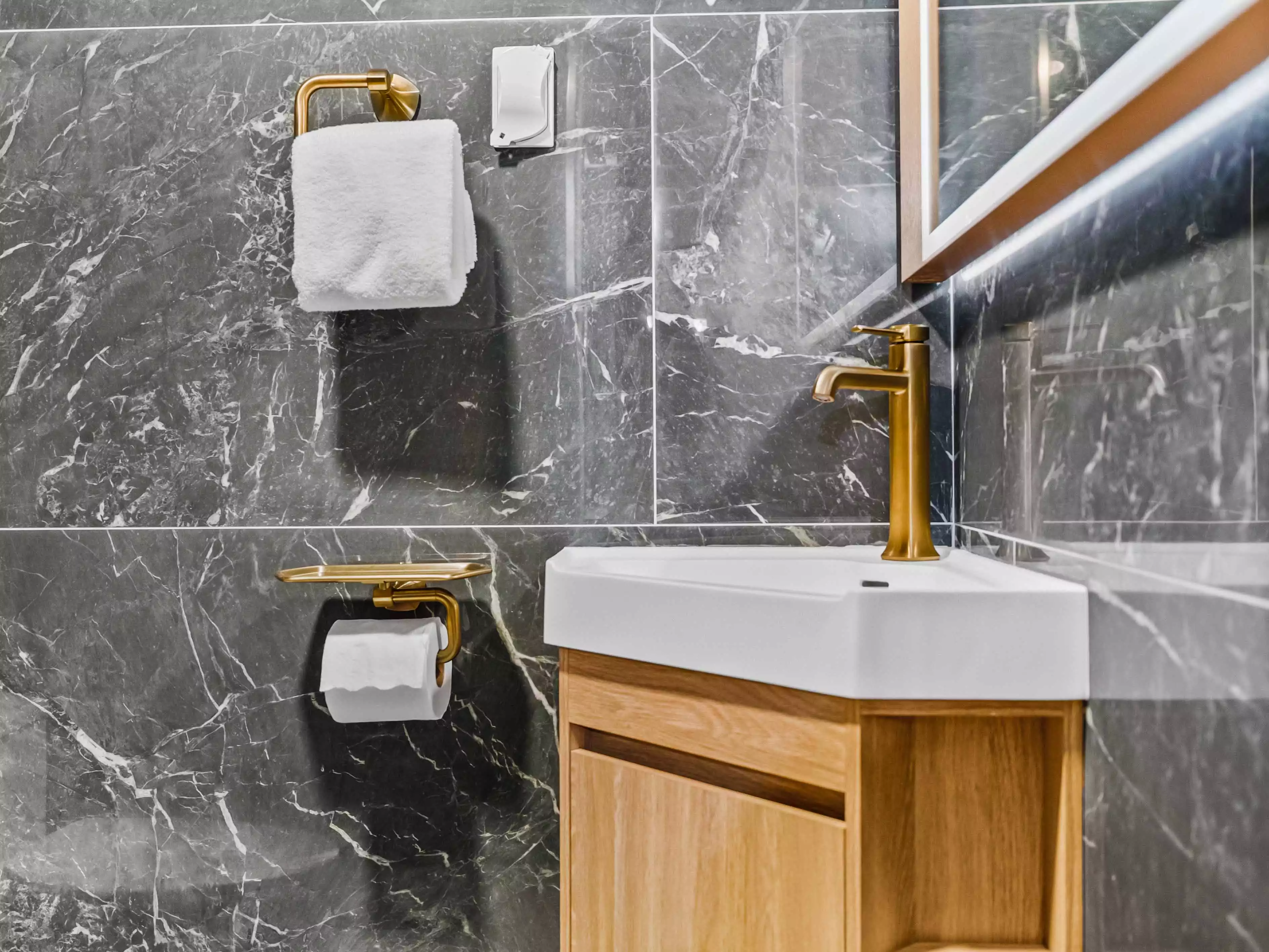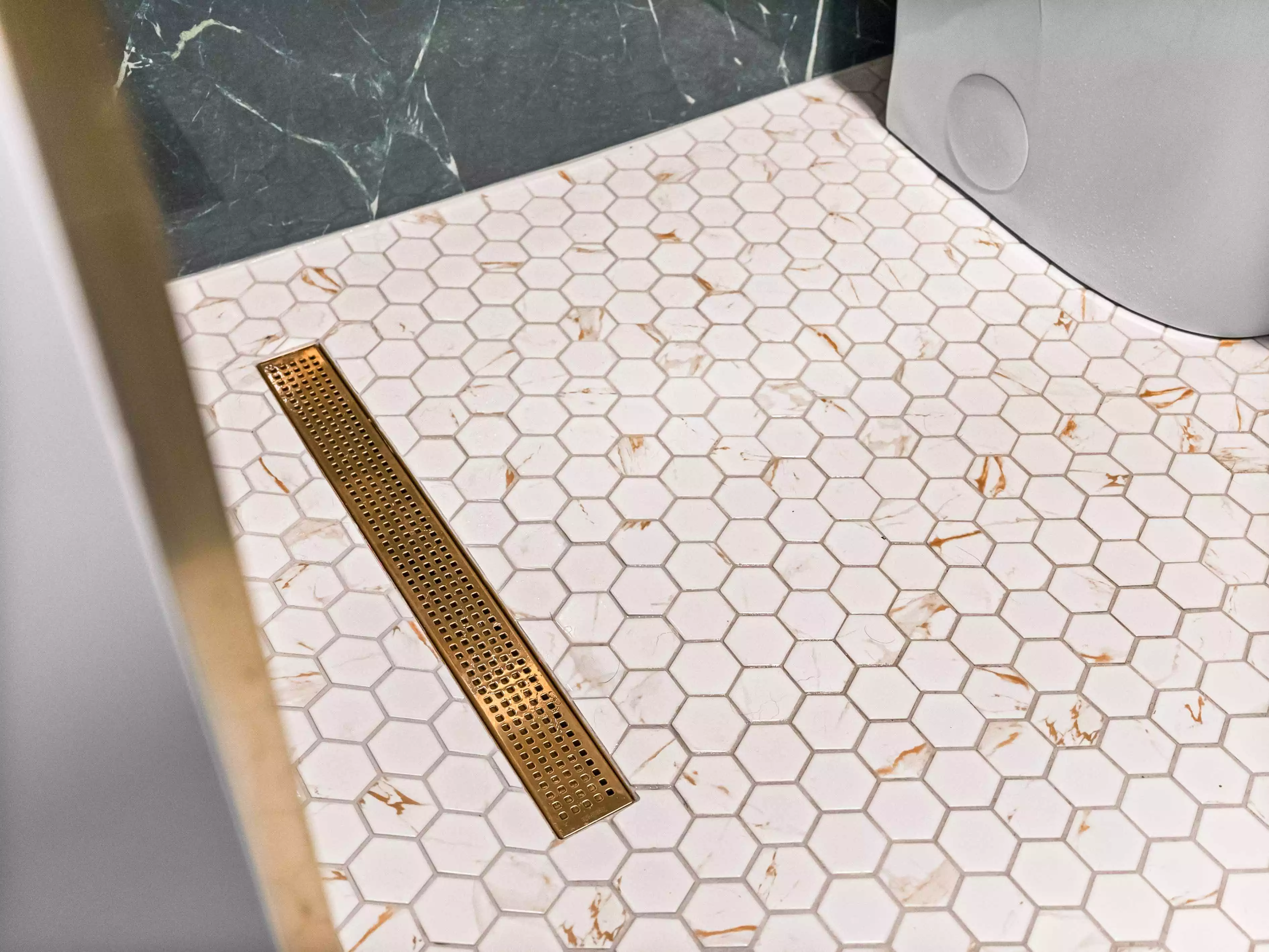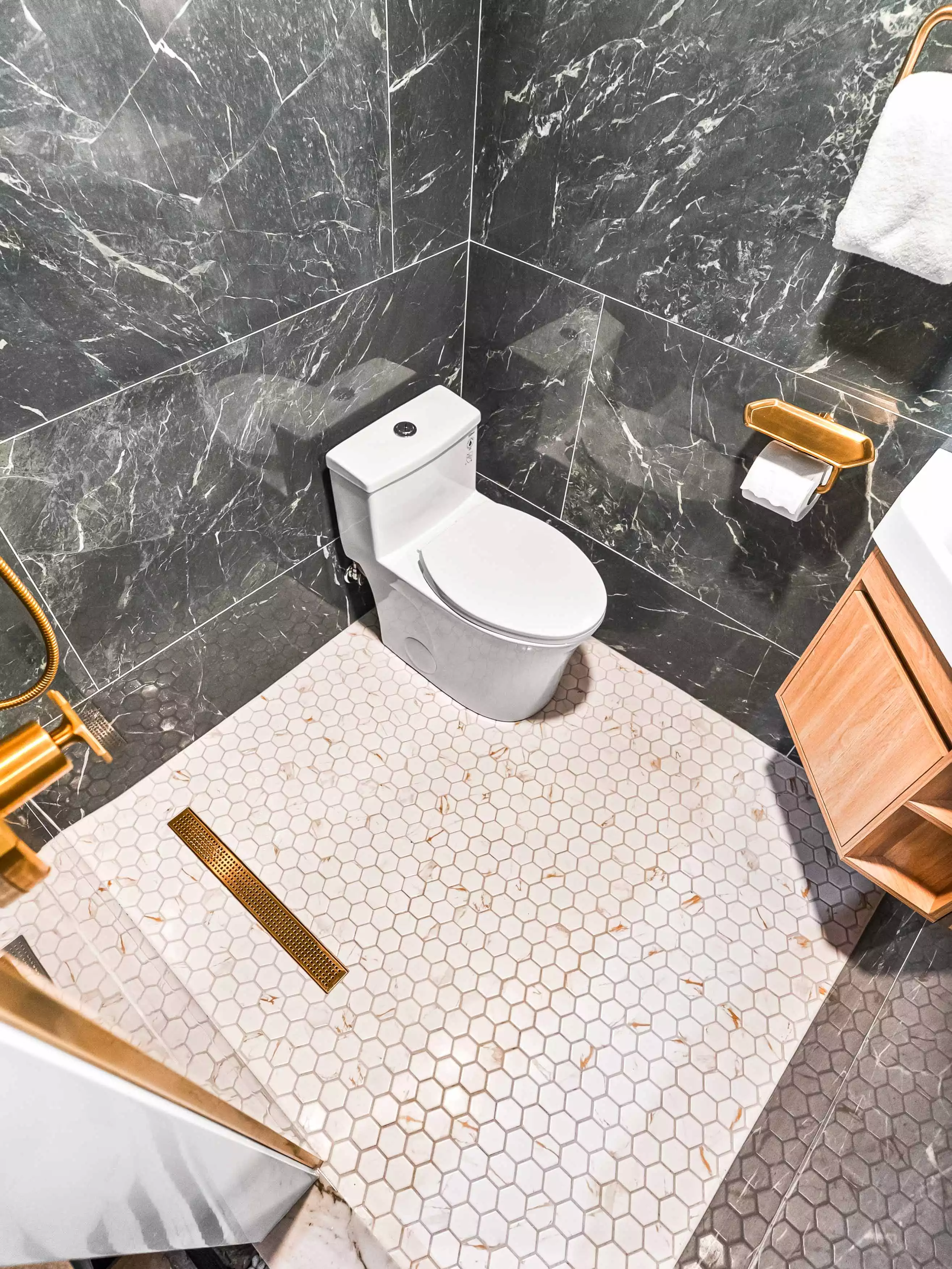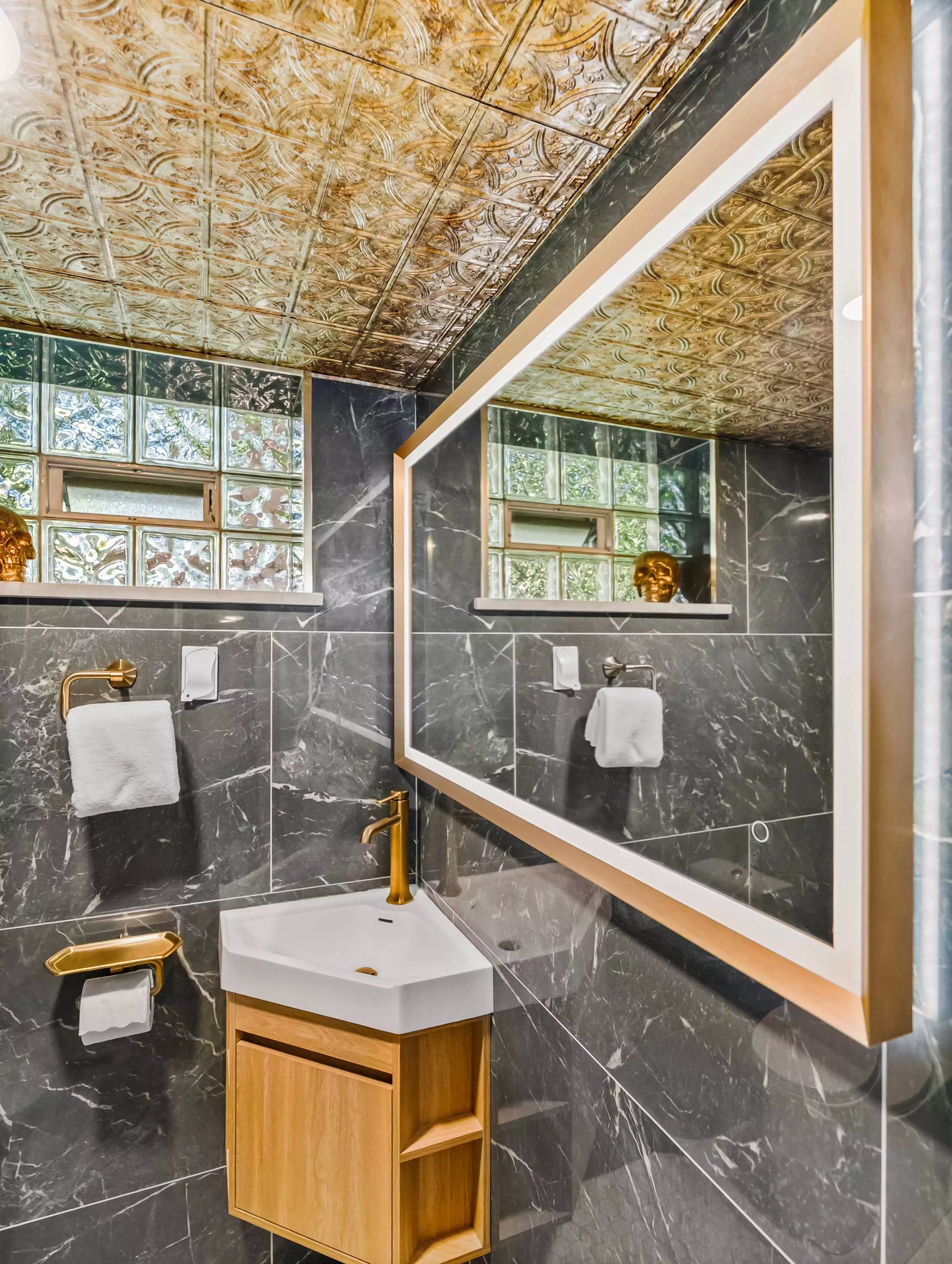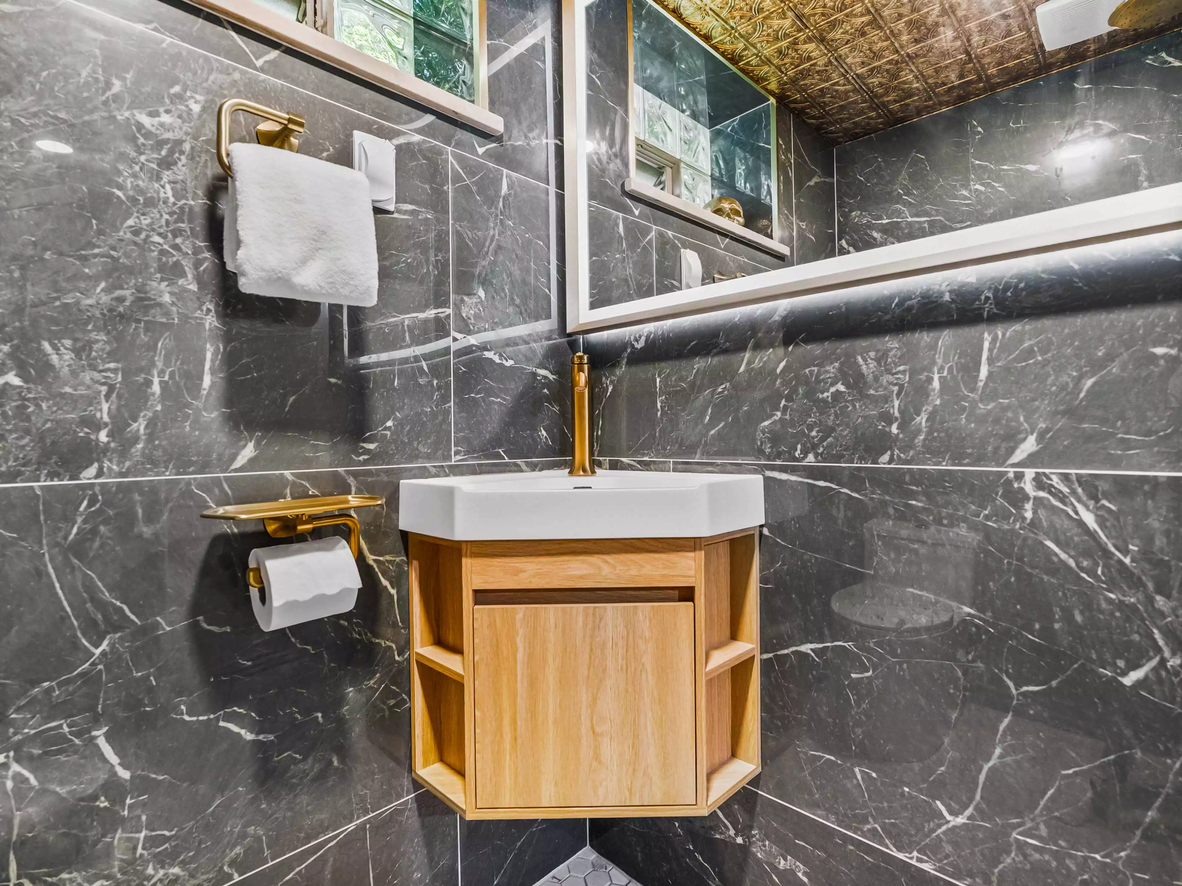 Bold Black Marble Walls & a Copper Tin Ceiling | Modern Bathroom Remodel