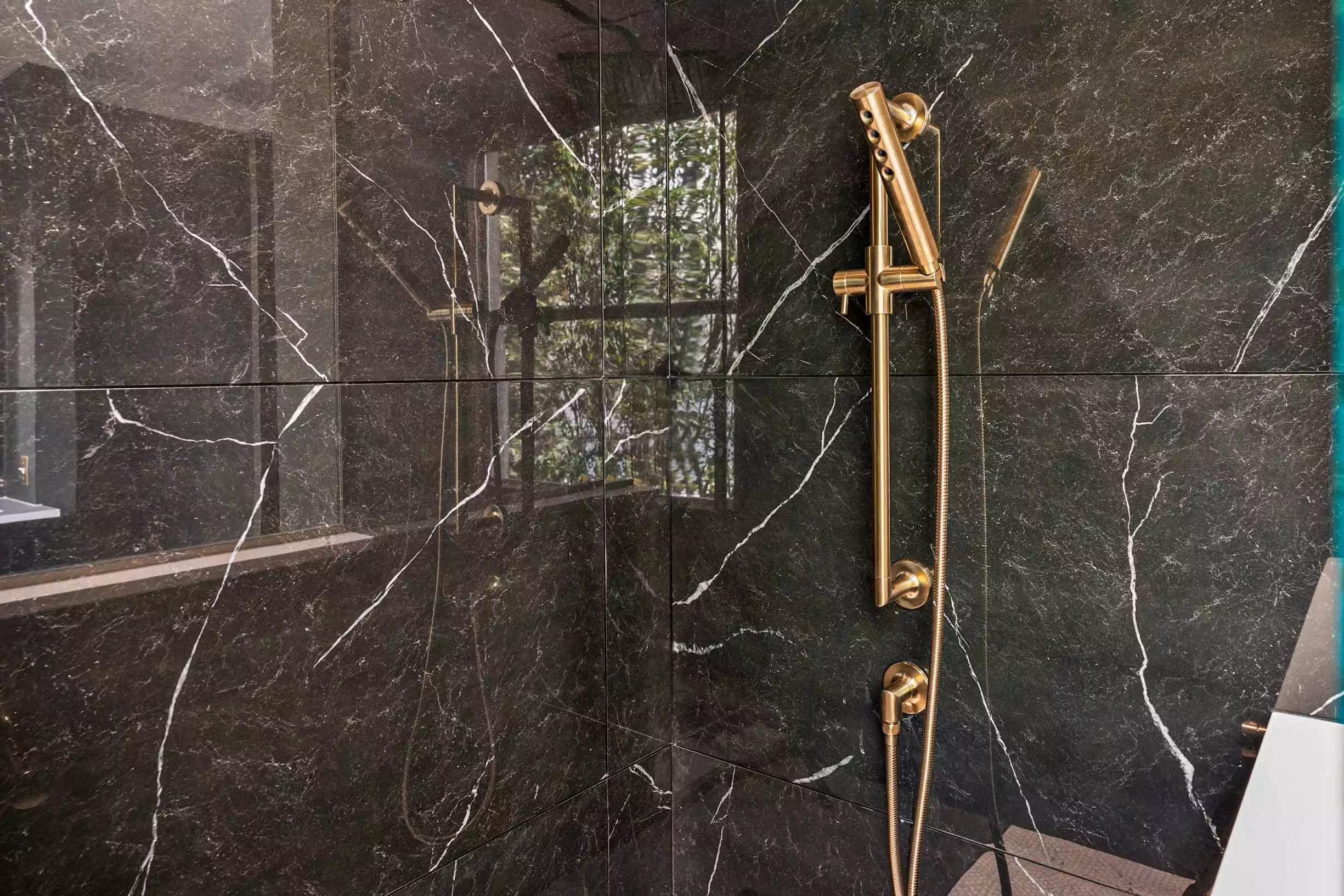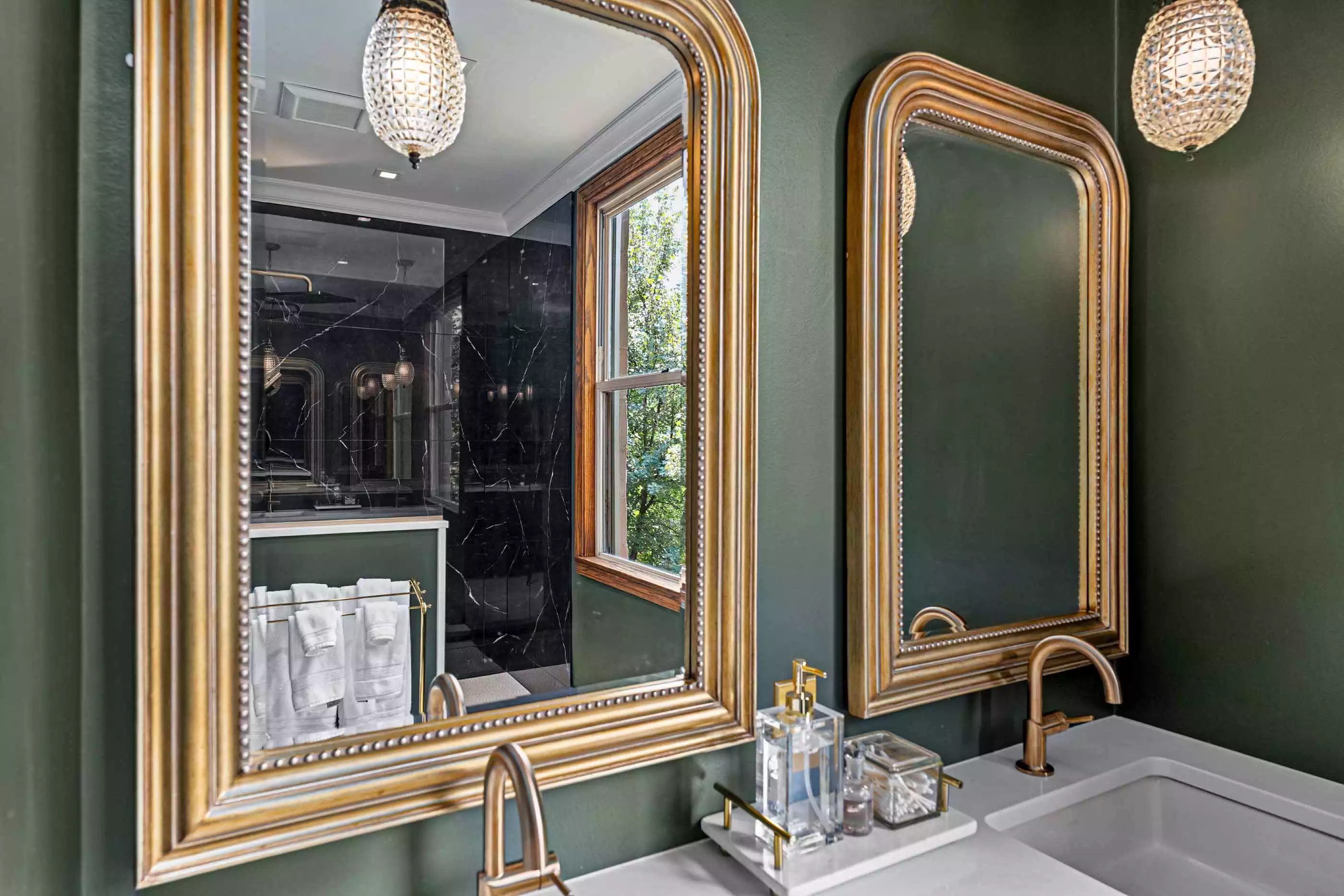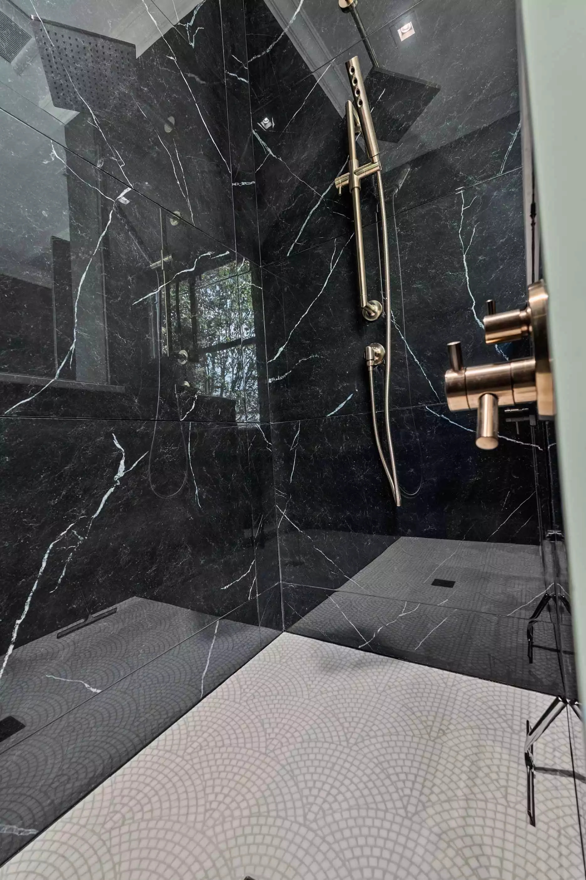 This bathroom is defined by its sophisticated color palette of deep green, black, and white. The dramatic, glass-enclosed knee-wall and shower is lined with large-format black tile with prominent white veining. The entire space is accented with brushed gold fixtures, hardware, and mirror frames. The clean, white mosaic tile floor leads all eyes back to the main focal point of the shower.