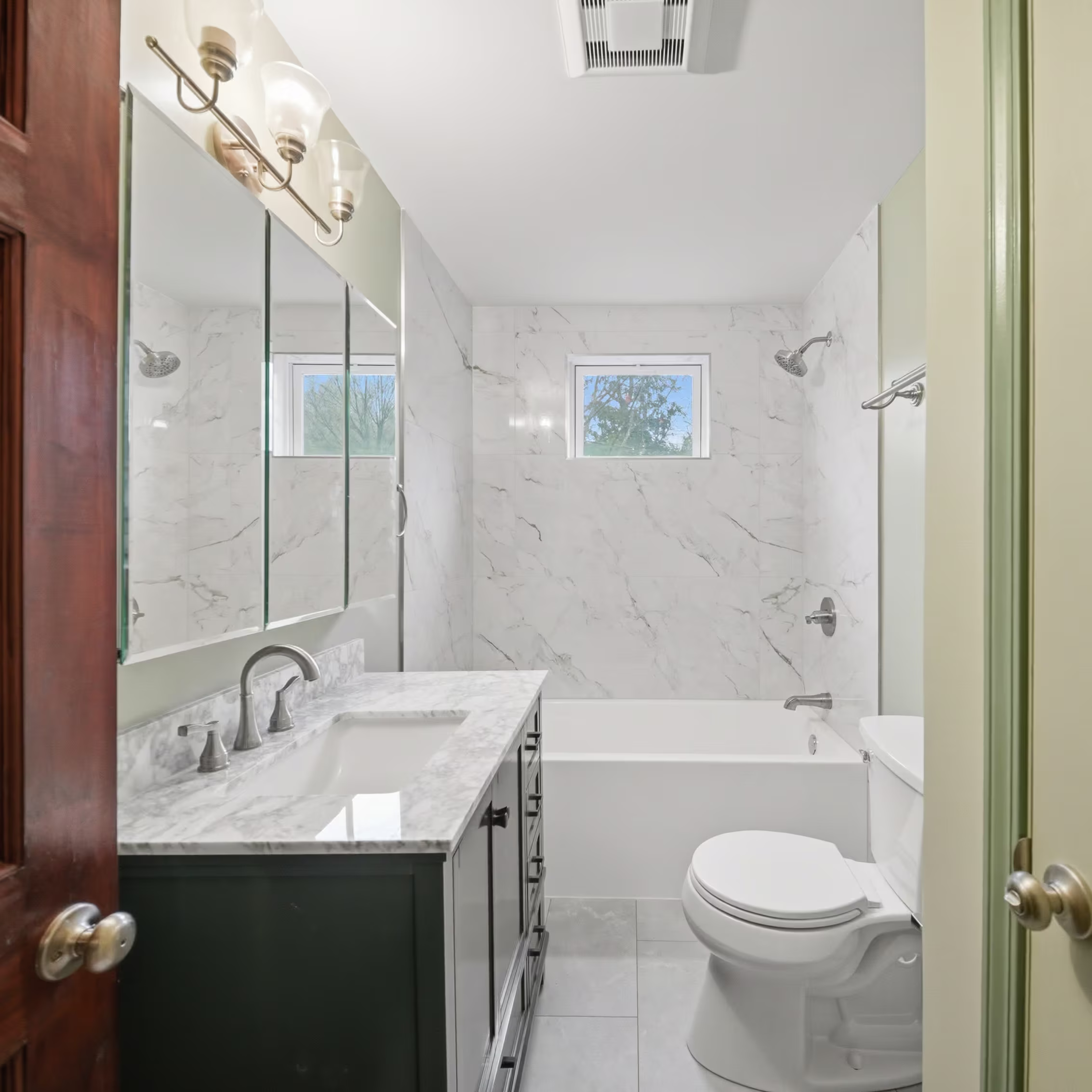 Oh ya, baby. The client had no idea what she wanted except that she wanted something that was bold, colorful, and fun. We started this project by having to really scratch our heads to figure out how to fit everything in. If you look at the before pictures you will see that we had to move everything around. To put in the vanity, we moved the door to the opposite wall. To put the shower near the window, we had to move the toilet, existing sink, and the radiator. Once the layout was finalized, we had a ton of fun going through several iterations of the design with the client and used orange octopus wallpaper, an ocean blue glass tile in the shower with 2 water outputs and a big comfy bench, a large format 18" x 36" blue chevron floor tile, and a custom vanity with a wall mount spigot and custom shaped mirror.
