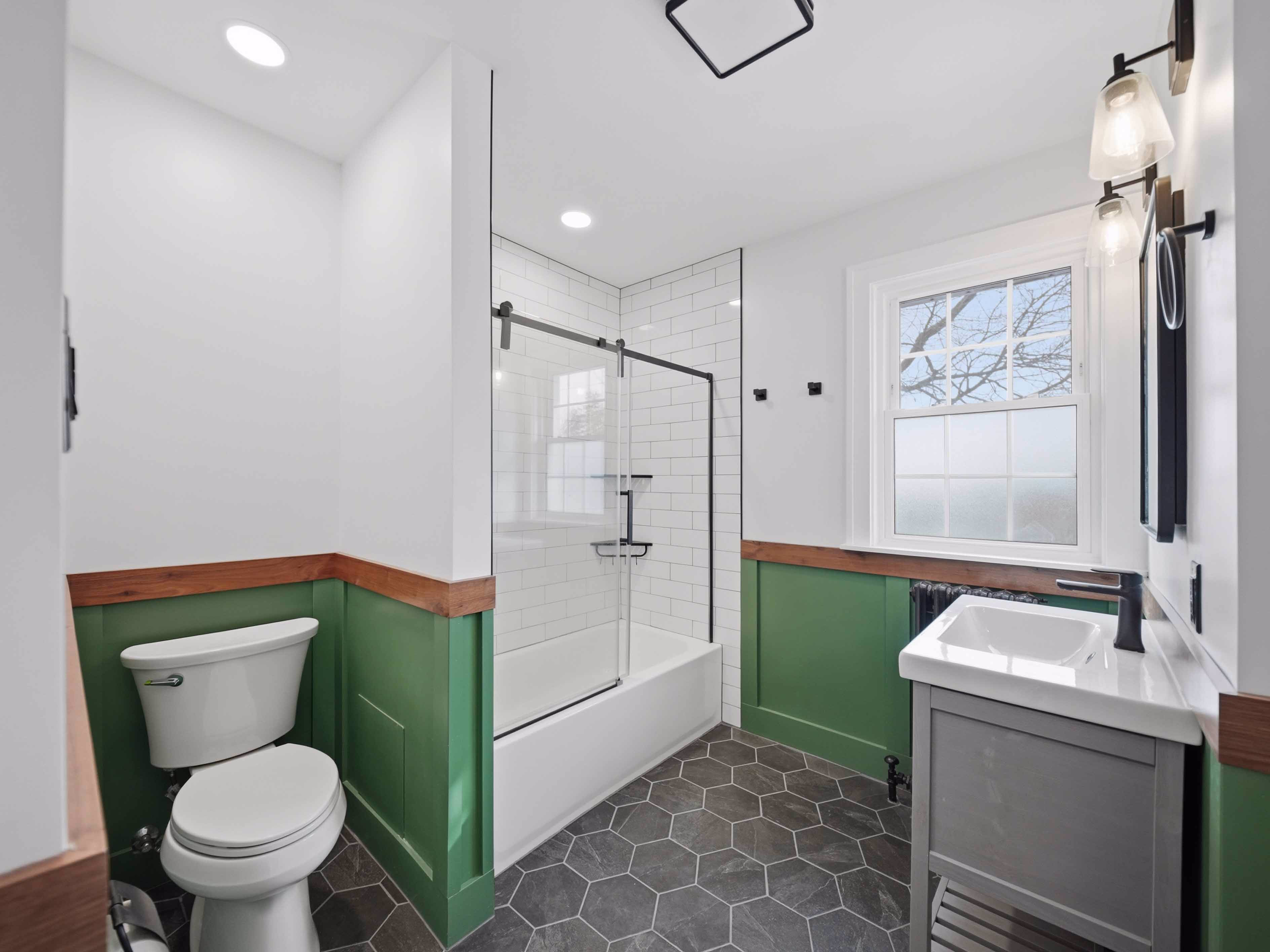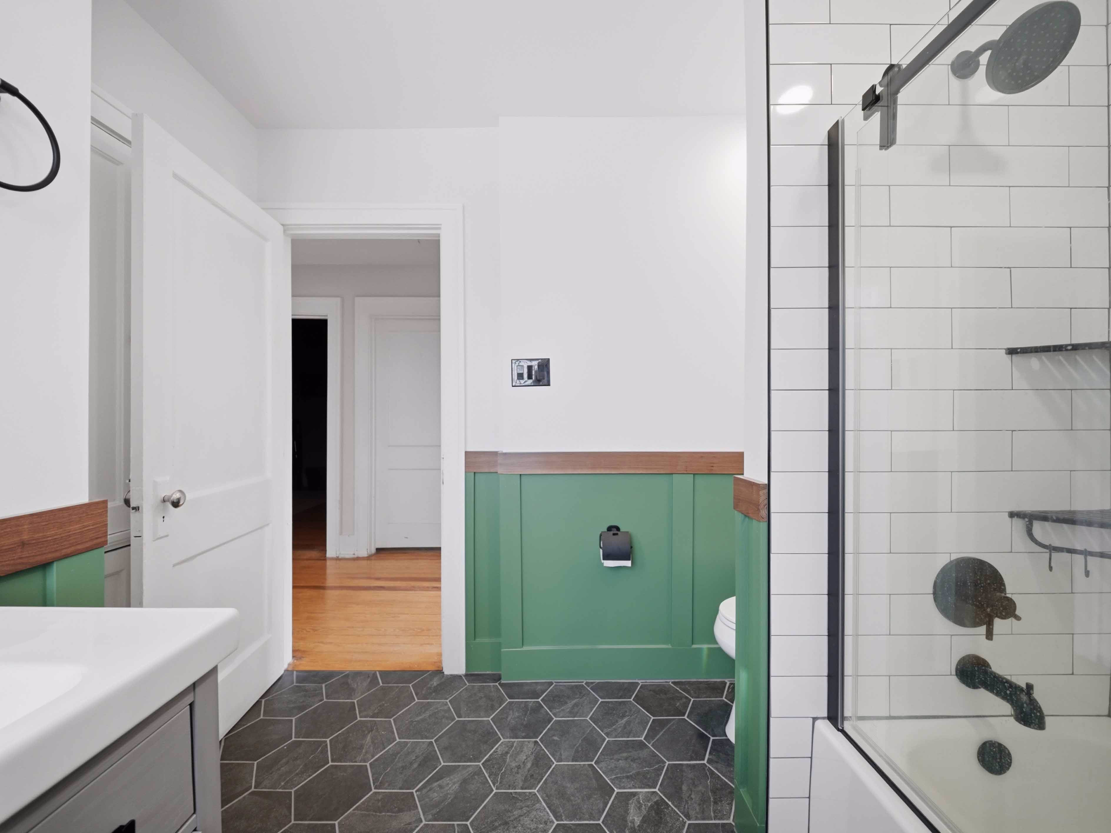 This remodel pairs custom forest green wainscoting with charcoal hex floors for a grounded, organic feel. We kept it feeling modern though by adding white subway tiles, a sleek grey vanity, and matte black fixtures.