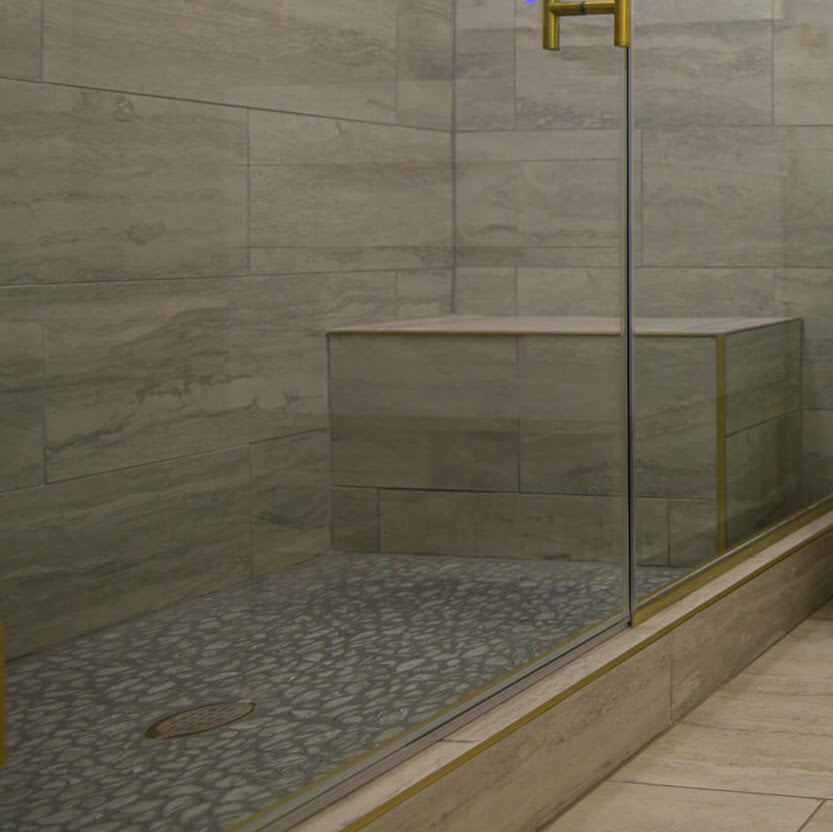 Getting rid of the old tub allowed us to put in a spacious walk-in shower. The client wanted a serene, spa-like experience so we wrapped the shower in large-format tile, used a relaxing pebble stone floor, and added a huge built-in niche. Other features include a custom shower bench.