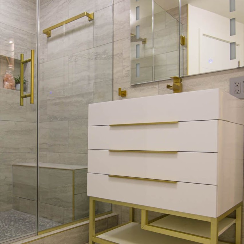 To finish, we used brushed gold fixtures and new modern doors to turn what was once a cramped corner into a truly spa-like escape.