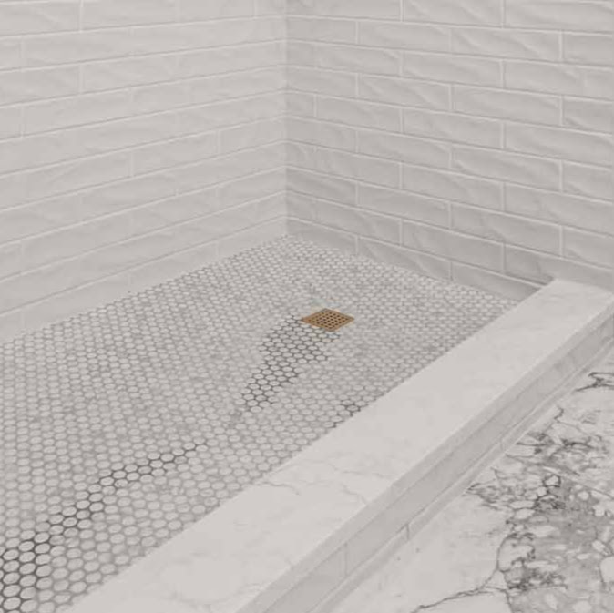 But the real fun was playing with texture. In the shower, we used this wavy, glossy white subway tile that has a beautiful watery shimmer to it, pairing it with a classic marble hex tile on the floor. For the main floor, we laid down these dramatic, large-format marble tiles that make the whole room feel so grand. It’s proof that you don't need wild colors to create a room with a ton of personality and style!