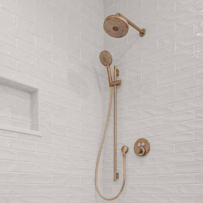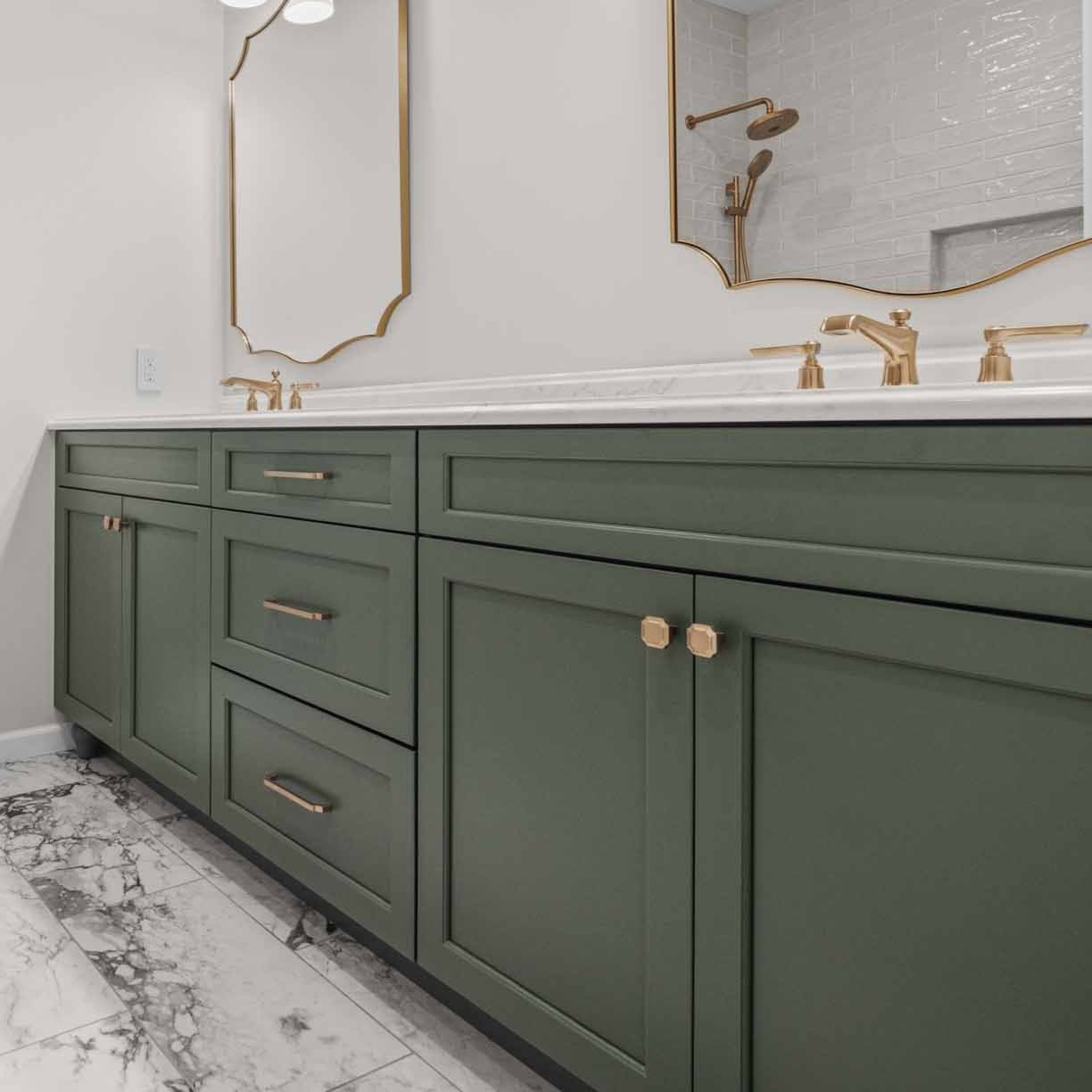 We decided to anchor the entire design around this deep sage green double vanity. It brings this amazing sense of nature indoors and became the starting point for all the other finishes. To add a touch of warmth and glam, we went with champagne bronze fixtures and hardware throughout.